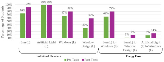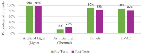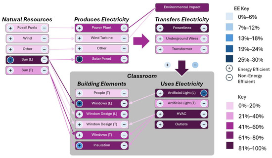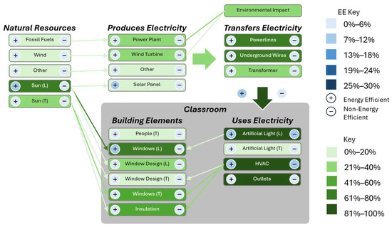 The next layer added to these diagrams is the student identification of individual elements as either energy-efficient (EE; represented by “+”) or non-EE elements (represented by “−”). For example, artificial lights might be annotated by students as being EE because of the energy-efficient light bulbs, or they could have been annotated as non-EE compared to daylight. Percentages for EE and non-EE elements are shown in blue shades in 6% increments ranging from lighter (lower percentage) to darker (higher percentage) to show which parts of the model were most prevalent across student tests from pre- to post-test. This visualizes, for example, the growth in the percentage of students identifying artificial lights as non-EE.