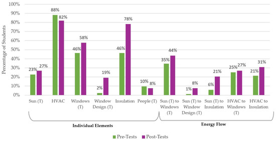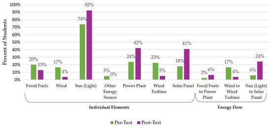Results are presented by first mapping codes over the systems model developed for the unit (Figure 3) and then examining the code frequences for pre- and post-tests side-by-side. The finalized codebooks were divided into two broad themes of individual elements (Appendix A) and energy flow through the system (Appendix B) and are shown as a systems model in the following section. Statistical analyses supporting the figures can be found in Appendix C.