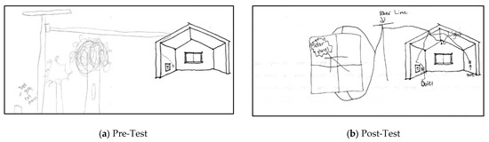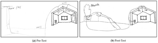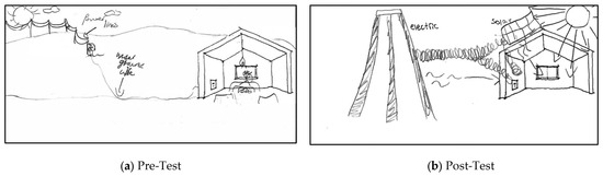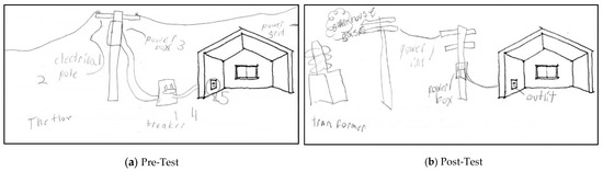 At the beginning of the unit, students were already demonstrating an understanding of transmission of electricity into buildings. The tests asked students to draw and explain how energy gets into their classrooms, and many pre-tests clearly showed power lines (65%) and/or underground wires (69%; Figure 11). It was unclear from most tests whether students truly understood the infrastructure of buried electrical lines or if they were making a diagrammatic guess that electricity arrives from underground. Many such drawings showed the wires going directly to a wall outlet. In post-tests, students shifted toward power lines (81%; p < 0.05) over underground wires (37%; p < 0.001; Figure 11), likely because the EYE unit visuals emphasized aboveground power lines. However, it is possible that student concepts of energy transmission sharpened from vague lines in the ground to power lines as identifiable features of the energy grid. The idea of a transformer was represented in roughly equal proportions pre- to post-test, with just under a third of students including the idea of a transformer, breaker, or electrical box playing a role in transferring electrical energy (Figure 11). From pre- to post-test, students increasingly showed links between power plants and power lines (increasing from 8% to 31% of tests demonstrating this link; p < 0.001; Figure 11). This showed that students were beginning to connect the dots between energy production and transmission. The pre- and post-test drawings from Ren (Faith’s class) exemplify a student test that showed this kind of growth (Figure 12). Paired-sample statistical tests examining differences in “transfers electricity” codes from pre- to post-test are reported in Appendix C, Table A4.