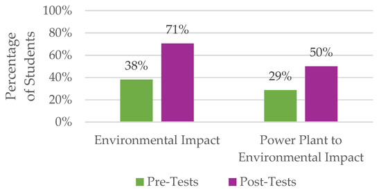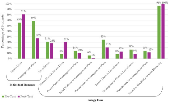 Module 1 of the EYE unit covered “energy systems” (see Figure 2, unit overview), which included an overview of renewable and nonrenewable energy sources that power the built environment. Students’ pre- to post-tests showed growth in describing the energy grid—from raw sources to methods of transmission. The sections below explore the changes in student tests in the categories of “natural resources,” “produces electricity,” “transfers electricity,” and “environmental impact,” as seen in Figure 6 and Figure 7.