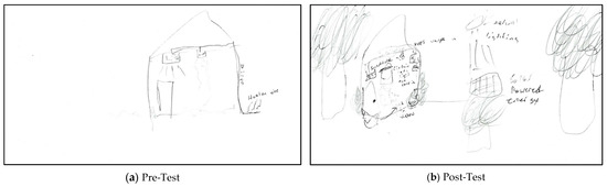 Pre-tests demonstrated a generally low grasp of natural resources being used for electrical energy. While more than 70% of pre-tests showed the sun as a source of light energy, the pre-tests had low percentages of codes for fossil fuels (20%), wind (17%), and other (such as water; 5%) being used as sources of electrical energy. In turn, the pre-tests also had low percentages of power plants (24%), wind turbines (23%), solar panels (18%), and other (such as dams; 4%) being used as sources of electrical production (Figure 8). While the percentage of post-tests featuring power plants increased by 18 percentage points (p < 0.05; Figure 8), the incorporation of solar energy was the largest shift from pre- to post-test with a 23 percentage point increase in mentions of solar panels (p < 0.001) and an 18 percentage point increase in the code for sun as a source of light energy (p < 0.05). This shift to include solar panels is exemplified in the pre- and post-tests by Austin (Figure 9) and Quincy (Figure 10) in Faith’s class (School 1). Another student in Faith’s class, Skylar, showed growth as well. Her pre-test mentioned an “outside force supplying energy,” but her post-test described how the “solar panel redirects the sunlight to the bulb for energy, curtains blackout extra sunlight, [the] electrical box directs energy to [the] outlet, [and] insulation holds temperature.” Paired-sample statistical tests examining differences in “natural resources” and “produces electricity” codes from pre- to post-test are reported in Appendix C, Table A3.