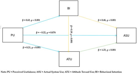 To further explore the mechanisms underlying actual system use, a second serial mediation analysis was conducted, this time examining the indirect effect of perceived ease of use (PEU) on system use via attitude toward use (ATU) and behavioural intention (BI). The analysis was carried out using the PROCESS macro (Model 6) [64], based on 5000 bootstrap samples and 95% bias-corrected confidence intervals.