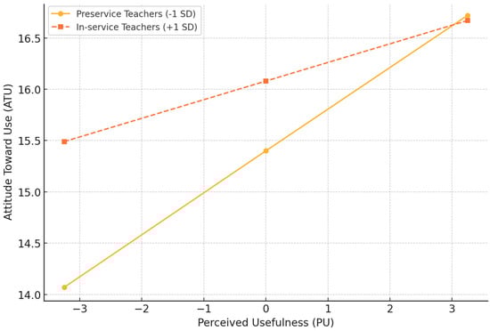 The relationship between perceived usefulness (PU) and attitude toward use (ATU) is moderated by teachers’ status (pre-service vs. in-service), such that the relationship differs depending on whether the teacher is pre-service or in-service.