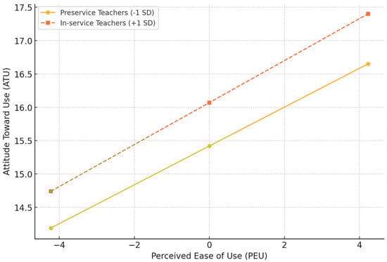 The relationship between perceived ease of use (PEU) and attitude toward use (ATU) is moderated by teachers’ status, such that the relationship differs depending on whether the teacher is pre-service or in-service.