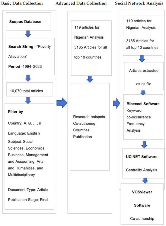 The specific analysis followed the following sequence: firstly, SCOPUS RIS data in Bibexcel was used to construct the frequency distribution, removing duplicates, selecting the top 20 relevant research hotspots, and creating a co-occurrence matrix. The generated matrix was treated in Excel before being exported to UCINET for the SNA centrality analysis. Afterward, the SCOPUS RIS data was imported to VOSviewer (Version 1.6.17) for the co-authorship analysis. The analysis covered countries such as Nigeria, China, and the top 10 countries that have poverty alleviation programs. Table 2 below presents the flowchart of the analysis framework.