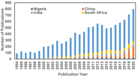 Particularly, the contribution of developing countries China (red), South Africa (yellow), India (ash) and Nigeria (royal blue) to poverty alleviation knowledge has been marginal, with China being a notable exception as shown in Figure 4. For instance, Nigeria’s contribution to poverty alleviation research remained low, accounting for less than two percent of the total research output over time. This lack of emphasis on research is further underscored by the country’s minimal investment in Research and Development (R&D) [38], amounting to less than 0.1 percent of its Gross Domestic Product (GDP). In contrast, China significantly increased its research output, surging from less than 2 percent in 1994 to over 30 percent by 2020. This outcome could have been influenced by China’s proactive approach to addressing poverty through substantial R&D investments, allocating over two percent of its GDP to research initiatives [39].