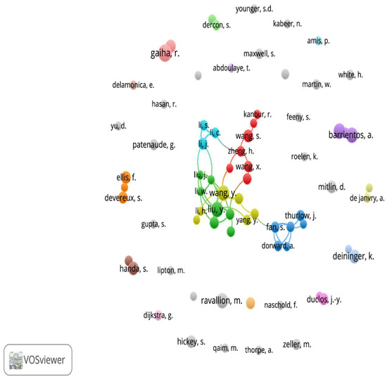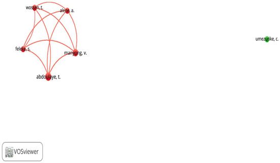 Despite the recognized advantages of co-authorship in enhancing research productivity, generating high-quality publications, and increasing citation rates compared to single authorship, co-authorship appears to be relatively limited in the context of poverty alleviation research, as illustrated in Figure 5 and Figure 6. For instance, among the 280 Nigerian authors examined, only 6 authors (representing 0.02% of the total) engaged in co-authorship, based on the VOSviewer’s threshold criteria of a minimum of three publications per author. Similarly, among the 5681 authors from the top 10 publication countries, only 74 individuals (amounting to 0.01%) participated in co-authorship, using the VOSviewer’s threshold for authors with a minimum of five publications [40].