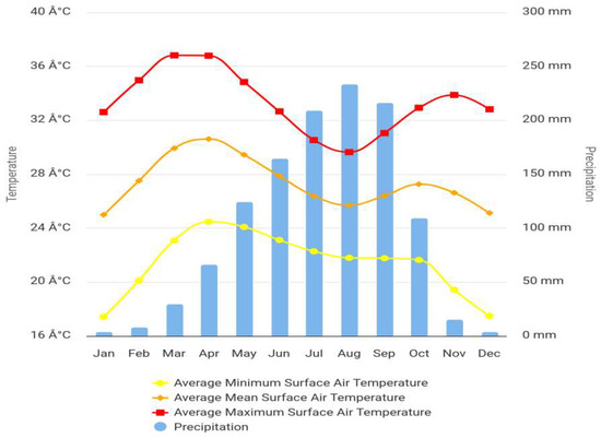 Climate change has remained one of the major challenges facing lives and livelihood across Nigeria [41]. The chart below (Figure 7) shows the monthly climatology of average minimum surface air temperature, average mean surface air temperature, average maximum surface air temperature, and precipitation in Nigeria between 1991 and 2023.