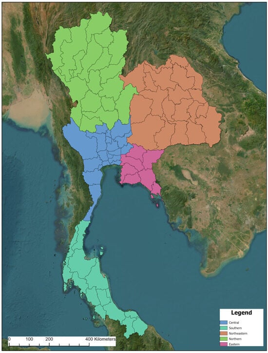 Thailand is located in Southeast Asia and has a population of approximately 70 million people. The country has a total land area of 513,120 square kilometers, with diverse geographical morphologies. These include northern mountains, a central plain, and a southern peninsular extension. Administratively, Thailand is divided into 77 provinces. These provinces are commonly grouped into broader regions. Following the categorization from the LDD, this study utilized a five-region classification, as illustrated in Figure 2. This included the Central, Northern, Northeastern, Eastern, and Southern regions. These regions differ in terms of topography, population density, urbanization levels, and economic activities. In addition, the land use data from the LDD were used to classify building types. At the level 1 categorization, this dataset consisted of urban and built-up land, agricultural land, forest land, water body, and miscellaneous land. For this analysis, only the urban and built-up land was selected to represent the building types. This included U1 (city, town, and commercial areas), U2 (villages), and U5 (industrial land), which correspond to commercial, residential, and industrial building types, respectively [24]. This categorization allowed for a more accurate estimation of the solar PV potential specific to each building type in Thailand. All the detailed data information can be seen in Table 1.