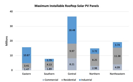 Figure 3 visualizes the total number of buildings used in this study, classified by five regions and three building types, namely commercial, residential, and industrial buildings. In total, the number of commercial, residential, and industrial buildings used in this study was 1,749,558, 9,244,385, and 267,056, respectively. Regarding the QA/QC process, one-way ANOVA was conducted to test differences in rooftop area estimation error rates between building types. The results indicated no statistically significant differences for any building type (F = 1.14, p = 0.35) when comparing ground truth and obtained building footprint data. This illustrated consistency across data sources and validated the methodological reliability of GIS spatial analysis.