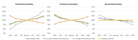 Sensitivity analysis of electricity price, PV system cost, and discount rate within the range from −20% to +20%.