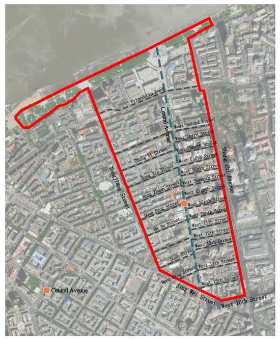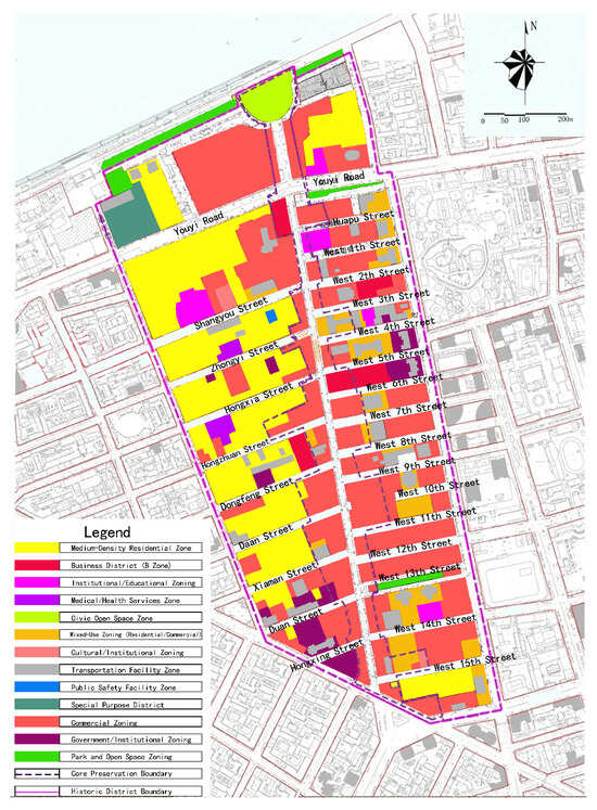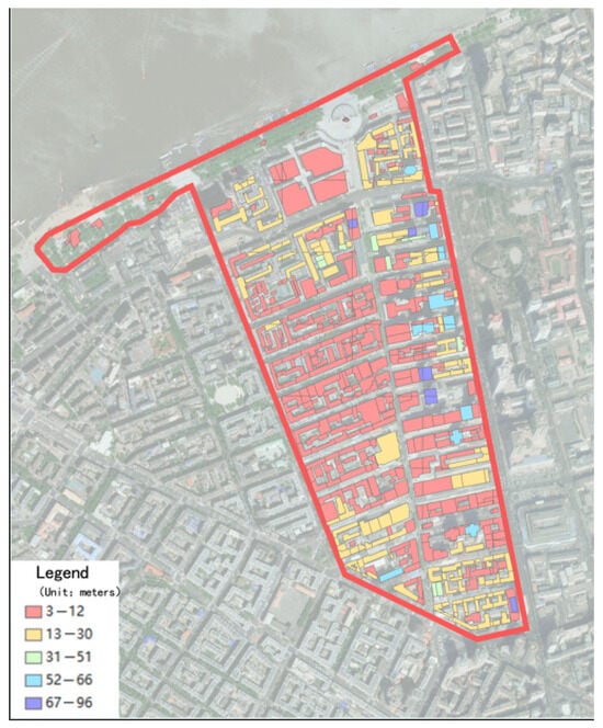 The specific scope of this study is shown in Figure 1, encompassed by Tongjiang Street, Jingwei Street, West 16th Road, Shangzhi Street, and the riverside shoreline. The land use planning scheme for this area (as shown in Figure 2) organizes space through three levels: historical building protection corridors, commercial composite function axes, and waterfront open space systems. Its three-dimensional spatial morphological characteristics are further quantified and characterized by the building height distribution map (Figure 3), which reveals the gradient change characteristics of the plot ratio in the core area from the historical districts to the riverside plots. The east–west roads include Youyi Road, West 2nd Road, Traditional Chinese Medicine Street, West 5th Road, Hongzhuan Street, West 7th Road, Dongfeng Street, West 9th Road, Da’an Street, West 10th Road, West 11th Road, Xiaman Street, Daoli 12th Road, Hongxing Street, West 14th Road, and West 15th Road, forming a clearly graded pedestrian commercial network.