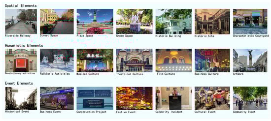 The current characteristics of the research site are systematically presented through integrated visual analysis (Figure 4). This comprehensive schematic diagram adopts a three-column layout corresponding to spatial, humanistic, and temporal elements: In the spatial dimension, it focuses on displaying real-life scenes of riverside trails, cross-sectional views of street spaces, square activity scenarios, historical building facades, and floor plans of characteristic courtyards. In the humanistic dimension, it conveys the stratification of cultural memories through identifiers of revolutionary sites, photography of folk festivals, street music performances, drama poster archives, the evolution of commercial signage, and public artworks. In the event dimension, it constructs a spatiotemporal evolution axis of significant events by overlaying historical maps, comparing construction timelines, visualizing heatmaps of festival pedestrian flows, presenting reports on celebrity events, logging residents’ activities, and compiling cultural event chronologies. This multi-element juxtaposition visualization strategy not only preserves the original characteristics of various current information but also enables cross-dimensional associative interpretation through spatial referencing system alignment and temporal axis synchronization, providing verifiable foundational data for subsequent spatiotemporal analysis and cultural gene extraction.