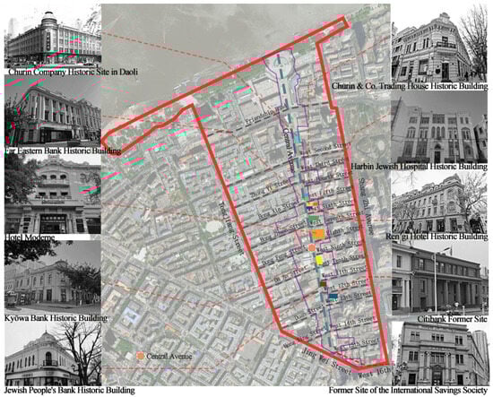 To deeply understand the cultural dimensions of the historic district, field investigations were conducted at ten core heritage buildings along Harbin’s Central Street, including colonial trade, financial, and cultural landmarks such as the Churin Department Store, Far East Bank, and Hotel Moderne (Figure 5). These investigations revealed a palimpsestic cultural landscape where Russian Art Nouveau, Jewish Eclecticism, and Manchukuo-period architectures coexist, demonstrating Harbin’s historical significance as an East Asian cross-cultural hub. Our analysis highlights the need to further explore spatial communicability theories, particularly adaptive regeneration mechanisms for ritualistic spaces. Notable examples include Hotel Moderne’s transformation of its historic diplomatic hall into an immersive theater featuring holographic recreations of the 1929 Sino-Soviet conference and the former Jewish Hospital’s adaptive reuse that preserves architectural integrity while converting archival spaces into interactive medical history exhibitions. These interventions demonstrate how functional reprogramming unlocks heritage’s cultural decoding potential.