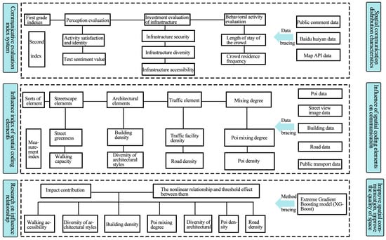 Most existing research focuses only on media communicators, media content production, media content distribution, media users, etc. [38]. This study attempts to investigate the impact mechanism of media production content’s encoding information and process on spatial communicability (see Figure 6). The research is divided into four stages. First, the research object is selected. In this study, the research object is Central Street in Harbin. Central Street is chosen as the research object of a cultural characteristic district because it is the intersection of Harbin’s history and modernity, featuring a diverse range of architectural styles and witnessing the city’s glorious development. Based on Dianping data and mobile signaling data, this paper constructs an evaluation index system for spatial communicability from the dimensions of perceptual evaluation, infrastructure evaluation, and behavioral activities. It calculates the distribution characteristics of spatial communicability under different dimensions. Subsequently, the scale and level of communicability are divided into four categories. These include street view elements, architectural elements, transportation elements, and mixed-use elements, forming a human-scale spatial information-encoding element impact index system. Finally, the study uses the XGBoost model to accurately find the key drivers of communicability and understand how spatial information elements affect it in cultural districts. The goal is to offer planning advice for improving these districts’ communicability and supporting high-quality urban development.