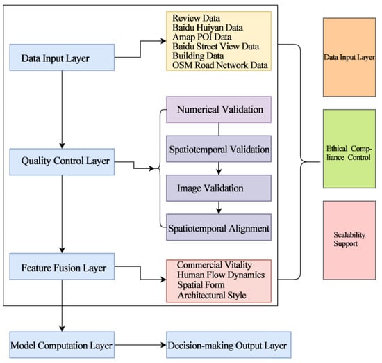 Following data standardization, cross-source feature fusion is achieved based on the spatial semantic association matrix: (1) commercial vitality evaluation combines Dianping sentiment analysis (using the BERT model) with POI density kernel estimation [44]; (2) human flow dynamics analysis uses an improved ST-DBSCAN algorithm for Baidu Huiyan trajectory data (spatiotemporal threshold = 50 m/300 s); (3) street-view images, after SegNet semantic segmentation (mIoU = 0.73), yield 15 morphological indicators, including green view rate and interface continuity; and (4) building style classification is performed by fine-tuning ResNet50 (top-5 accuracy of 92.4%), with feature-level and road network centrality indicator fusion via graph convolution. A full-process parameter documentation mechanism is established, covering (1) data collection time-sequence control (such as 120 ± 30-s collection interval for review data); (2) model training details (SegNet uses the VGG16 backbone, trained for 150 epochs with a weighted cross-entropy loss function); and (3) validation and testing benchmarks (POI classification F1-score ≥ 0.85, spatial accessibility calculation error rate < 8%). Data–code–parameter version linkage is achieved via DVC (Data Version Control).