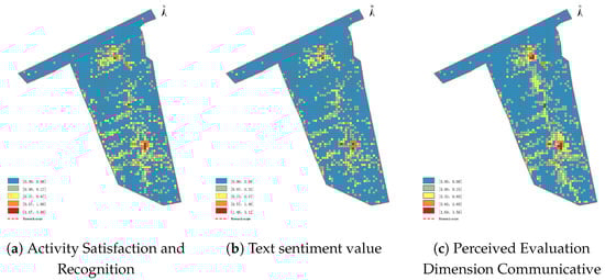 The satisfaction and sense of identity (Figure 9a) combined with the emotional value of the text (Figure 9b) calculate the communicative characteristics of the neighborhood space based on perceived evaluation (Figure 9c). Statistical analysis revealed a mean spatial communicability of 1.34 (range: 0.08–3.56) across the urban blocks. Emotional value distribution exhibited a primary–secondary structure: Central Avenue Main Street as the core, supplemented by Jin’an International Commercial Zone and Flood Control Memorial Tower Area. These tourism-consumption hotspots demonstrated positive tourist experiences, high merchant ratings, and favorable reviews, attributed to proactive merchant adaptation. Elevated emotional values clustered around high-communicability zones, while others were sporadically distributed. Low-communicability zones predominated in peripheral areas, resulting in reduced commercial vitality due to Central Avenue’s dominance and insufficient visibility.