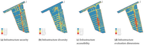 By calculating the security (Figure 10a), diversity (Figure 10b), and accessibility (Figure 10c) of infrastructure, the spatial communication characteristics of blocks based on infrastructure evaluation are obtained (Figure 10d). Analysis indicated spatial communicability values ranged from 0 to 11.54 (mean: 3.56), displaying a monocentric multicluster pattern with contiguous low-value zones. Peak values concentrated along Central Avenue Main Street and adjacent nodes, demonstrating infrastructure distribution coherence through safety–diversity–accessibility alignment that mirrored population activity patterns, facilitating governmental infrastructure optimization and population aggregation. Median values clustered near high-value zones (surrounding residential streets and niche attractions), while low-value zones predominantly occupied peripheral zones of the study area.