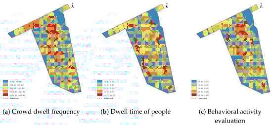 Frequency of crowd dwell time. The duration of the crowd’s stay in a space is a prerequisite for various activities, reflecting the space’s attractiveness to the crowd [33]. This study uses statistical data on the number of times people reside in a certain spatial unit over a one-month period to measure the communicability level of that space (Formula (6)).