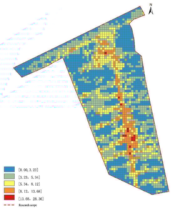 In the formula, C represents activity satisfaction and sense of belonging. corresponds to the total sum of sentiment scores for all venues within spatial unit i, where these sentiment scores are derived from analyzing online textual reviews of each venue using the ROS-TCM6 semantic analytics platform. n denotes the number of venues within the spatial unit, with this count determined by the number of POI (point of interest) data points captured through technical extraction methods. Each standardized spatial unit covers a 30 m × 30 m area.