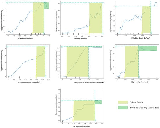 Partial dependence plots are also one of the widely used analytical tools in machine learning. They visually display the relationship between the dependent variable and independent variables, allowing for an intuitive revelation of the actual effects that independent variables have on the dependent variable [46]. In this article, Figure 13 shows the partial dependence of the independent variable, where the y-axis represents the overall communication score, and the x-axis reflects the specific range of values for a certain independent variable. Analyze the partial dependency diagram of seven spatial information coding factors closely related to the comprehensive communicability of culturally distinctive street blocks, specifically in terms of four aspects: street scene elements, architectural elements, road elements, and mixed-use. These factors include walkability, street greenery, building density, POI mix, architectural style diversity, POI density, and road density.