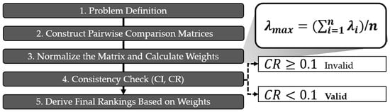 The AHP is a structured multi-criteria decision-making method that quantifies subjective judgments through pairwise comparisons within a hierarchical framework [22,23,24,25]. Typically, the AHP involves decomposing the decision problem into a hierarchical structure consisting of a goal, criteria, and sub-criteria. Judgments are collected using pairwise comparisons based on a 1–9 scale, relative weights are calculated using eigenvalue methods, and the internal consistency of responses is assessed through the consistency ratio (CR) [26,27]. In this research, AHP was chosen due to the clearly defined hierarchical structure of the decision problem. The AHP method is particularly effective in disaggregating complex decision-making processes into a goal–criteria–alternatives framework, facilitating systematic pairwise comparisons and the quantification of expert judgments. The use of the CR further enhances the reliability and transparency of the evaluation by verifying the internal consistency of responses. While ANP is suitable for modeling interdependencies among criteria, its use was deemed unnecessary given the clearly structured and independent hierarchical design of this research. Similarly, alternative methods such as ELECTRE and VIKOR emphasize elimination or compromise solutions rather than generating a definitive ranking of alternatives, rendering them less appropriate for the research objectives. Accordingly, the AHP was selected as the most suitable methodology to ensure clarity, validity, and interpretability of the assessment outcomes. In this research, AHP was employed to determine the relative importance of the 25 planning elements identified through the FGIs. These elements were organized into a three-level hierarchical structure. Two respondent groups—30 experts and 130 residents—were surveyed using Saaty’s 1–9 scale to perform pairwise comparisons of the planning elements. Individual responses were aggregated using the geometric mean method to generate group-level comparison matrices. Weights were computed by normalizing each matrix and deriving the principal eigenvector. The consistency of responses was assessed by calculating the CR, and any pairwise judgment sets with CR values exceeding 0.1 were excluded from further analysis to ensure the reliability of the results. This approach guaranteed the internal validity of both expert and resident input. The resulting weights for each planning element, as perceived separately by experts and residents, were subsequently used as input parameters for the TOPSIS analysis to evaluate and rank redevelopment alternatives. The general AHP process is shown in Figure 1 and detailed process that describes this research AHP process is shown in Appendix A Figure A2.