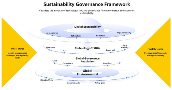 The increased risk of global environmental change creates significant economic sustainability issues that require immediate action. Along with the pace of global warming, loss of biological diversity, and pollution, orthodox economics can no longer handle it. It might initiate an oncoming crisis for access to resources and economic stability [7]. The most crucial gap to be filled is the correct harmonization of digital technology and global systems of governance for overseeing these environmental hazards without hindering economic development, as shown in Figure 1. Digital technologies offer new instruments for enhancing governance and regulatory performance, but significant gaps exist in access and enforcement [8]. Secondly, environmental law must be implemented in a manner that facilitates compliance and promotes sustainable development. With proper governance law encompassing these technologies and legal frameworks, nations risk forfeiting the advantage of averting environmental challenges, undermining their long-term economic sustainability. This research aims to analyze how environmental law and ICT can be utilized for the benefit of good governance in avoiding environmental risks, enhancing resilience, and ensuring sustainable economic interventions worldwide [9]. This intersection should be addressed in achieving a sustainable future that fosters harmony between economic development and environmental well-being [10].