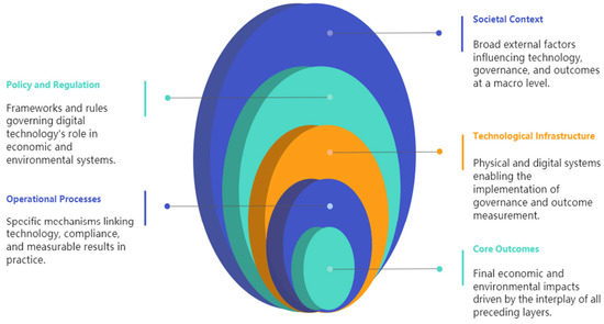 Illustration of the interdependent relationship between policy, economic development, digital technology, governance regulation, and global environmental challenges and laws. Policy and economic development drive economic growth and guide societal progress, and digital technology is responsible for innovation, efficiency, and decision-making based on facts. Governance regulation provides checks and balances for effective policy implementation and accountability, collectively addressing the pressing global environmental challenges and promoting sustainability and inclusive development. This study provides a Digital–Green Governance (DGG) framework that connects worldwide environmental risks, economic resilience, and legal adaptability using digital innovation. It integrates technological facilitators, blockchain, green surveillance, regulatory mechanisms, dynamic policies, and smart contracts for conformity, and institutional drivers, SDGs, stakeholder theory, and isomorphic policy diffusion to explain the accept/dismiss option of governance. Through matching digital solutions with adaptive legal frameworks, the model addresses climate resilience, green finance, and enforcement. Based on the Technology-Organization-Environment (TOE) framework and institutional theory, it offers a holistic answer to disconnected sustainability issues, ensuring policy alignment and economic resilience.