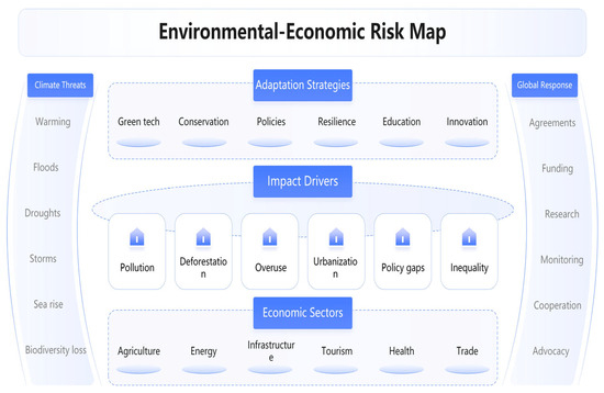 Global environmental change poses a significant threat to economic sustainability through the destabilization of ecosystems, resource depletion, and increased frequency of climate disasters, collectively undermining long-term financial stability [85]. Coastal erosion and extreme weather conditions ravage infrastructure and agricultural production, as shown in Figure 4, whereas loss of biodiversity reduces the ecosystem services crucial to agriculture and the pharmaceutical sector. The scarcity of resources such as water and productive land, in particular, heightens geopolitical tensions and the cost of production. These environmental pressures extend across global supply chains, inducing increasing insurance costs and disproportionately affecting fragile economies, which in turn can lead to recessions and exacerbate existing inequalities. Reducing these risks requires decisive policy responses, secure resource management, and global cooperation to transition towards low-carbon economies [86]. Positively mapping potential risks, Figure 4 analyzes the impact of environmental changes, such as climate change or dwindling resources, on economic stability and advises businesses and governments on how to mitigate risk and strategize.