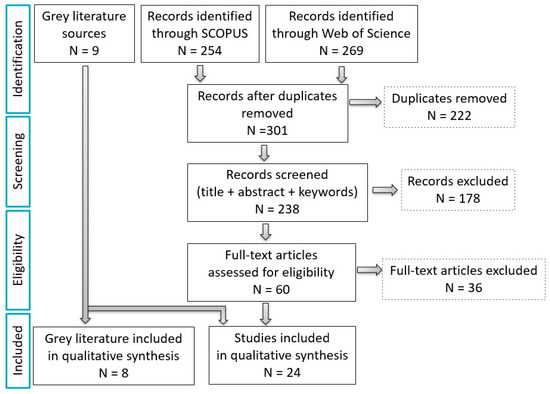 - Page, M.J.; McKenzie, J.E.; Bossuyt, P.M.; Boutron, I.; Hoffmann, T.C.; Mulrow, C.D.; Shamseer, L.; Tetzlaff, J.M.; Akl, E.A.; Brennan, S.E.; et al. The PRISMA 2020 statement: An updated guideline for reporting systematic reviews. BMJ 2021, 372, 71. [Google Scholar] [CrossRef]