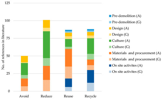 She et al. [73] previously highlighted the long-term impacts of decisions made at the pre-design stage of a project on potential construction and demolition waste. However, concerningly, there are fewer coded strategies for the avoidance of waste than for any of the other levels of the hierarchy. Nonetheless, given the focus on recycling within the construction industry, the lack of dominance of strategies addressing the ‘Recycle’ level of the waste hierarchy is somewhat positive. The focus on recycling has previously been attributed to drivers, such as green building rating tools [56], in which credits are awarded for diversion of waste from landfill, as opposed to avoidance of waste in the first instance. It should be noted, however, that with a focus on strategies for the avoidance and minimisation of waste, the selection criteria for this review excluded papers whose sole focus was on a single recycled construction material (e.g., the use of recycled aggregate).