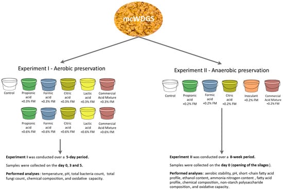Experiment I: mcWDGS underwent aerobic preservation. The material was placed in open, non-sealed plastic mini-silos of 15 L capacity in a storage chamber and maintained for 5 days at 25 °C, which is in line with Alvarez et al. (2019) [22] and Lehman and Rosentrater (2012) [14]. Each WDGS variant received a distinct additive and was prepared in triplicate, utilizing separate mini-silos for each replicate. A total of five different additives were used, each at two concentrations. All additives were incorporated during the mixing phase of the mcWDGS ingredients. Each additive was prepared by diluting it 50:50 (w/w) with distilled water. The final inclusion rates for these additives were 0.3% or 0.6% on a fresh matter (FM) basis, consistent with our preliminary findings and values recommended in the literature [25,32,33]. These additives included propionic (PA0.3%; PA0.6%), formic (FA0.3%; FA0.6%), citric (CA0.3%; CA0.6%), and lactic (LA0.3%; LA0.6%) acids, or a commercial acidifier mixture (CAM0.3%; CAM0.6%) (consisting of glycerin, propylene glycol propionic, lactic, orthophosphoric, formic, acetic, citric, and muriatic acid). The control variant (C1) was also prepared in triplicate, with mcWDGS preserved without any acidifier addition (Figure 1). Measurements in Experiment I were primarily performed on day 3 of preservation. This timeframe was selected based on practical considerations, such as typical transport to farms and storage duration, and aligns with the findings of Lehman and Rosentrater (2012) [14]. During the sampling procedure (at 0, 3, and 5 days of storage), mcWDGS was transferred from the mini-silos. Samples were either frozen at −20 °C for oxidative capacity analysis or dehydrated at 105 °C for chemical composition analysis. Analyses conducted on fresh material examined temperature, pH, total bacteria count (TBC), and total fungi count (TFC). For day 0, analyses such as TBC, TFC, chemical composition, and oxidative capacity were performed on a combined mean sample, assuming that these parameters would be uniform across all variants immediately after mixing due to the homogenous nature of mcWDGS. Subsequently, all variants were analyzed on the 3rd day. On day 5, however, analyses were performed exclusively on the mcWDGS variants that had not spoiled. The TBC, TFC, chemical composition, and oxidative capacity were analyzed on days 0, 3, and 5 of Experiment I; however, for day 0, only a mean value representing all the variants was given due to the practical impossibility of simultaneously collecting and preparing individual samples for each mcWDGS variant and replicate immediately upon additive application. Also, these chemical-physical analyses should not have been affected at day 0 in the same manner as pH was. Still, future studies should try to improve and incorporate collection time at day 0. Moreover, some samples appear to be missing by the 5th day of Experiment I; this was implemented on purpose, as these variants had already spoiled and would have been considered unsafe for livestock consumption. Analyzing feedstuff that could not be used in livestock nutrition would serve little to no purpose. The analyses performed during Experiment I were specifically designed to best illustrate and focus primarily on the effectiveness of conservation under aerobic conditions.