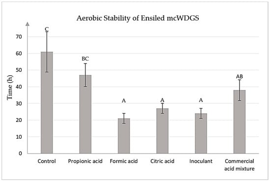 Aerobic stability of ensiled mcWDGS variants (p ≤ 0.01). Numerical values marked in pairs with letters ABC differ at p ≤ 0.01.