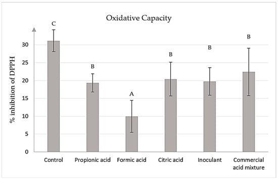 Percent inhibition of DPPH radical in the presence of different additives to ensiled mcWDGS (p ≤ 0.01). Numerical values marked in pairs with letters ABC differ at p ≤ 0.01.