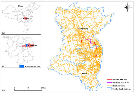 Study area and spatial distribution of vehicle operation routes. (a) Hunan Province’s location in China; (b) Changsha’s location in Hunan Province; (c) Electric bus operating routes.
