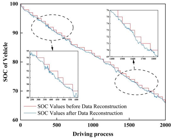 Based on the aforementioned principles, Figure 2 presents a comparison of the vehicle SOC data before and after reconstruction. The reconstructed SOC data eliminate the integer limitation of the original data, allowing accurate capture of SOC variations during vehicle operation, thereby facilitating the calculation of energy consumption using Equation (3).