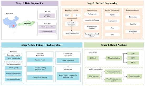 To investigate the nonlinear relationship between the battery energy consumption of an electric bus and various characteristics, this study employs a four-stage research approach: Data Preparation, Feature Engineering, Data Fitting, and Result Analysis, as shown in Figure 3.