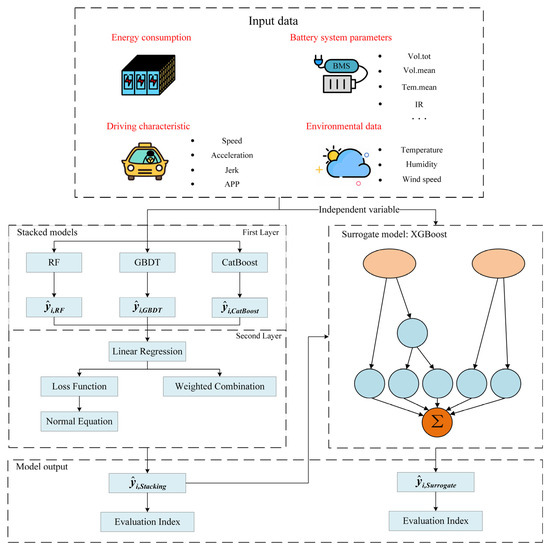The framework for fitting the influence relationships of battery energy consumption combines a stacking model and a surrogate model. First, a two-layer stacking ensemble integrates RF, GBDT, CatBoost, and Linear Regression to predict electric bus battery energy consumption. Stacking aggregate predictions from heterogeneous learners to improve accuracy and generalization. The ensemble adopts a layered architecture in which diverse high-capacity models perform nonlinear transformations in the first layer, and a lightweight meta-learner aggregates their outputs in the second layer. The electric bus operation dataset is partitioned using 5-fold cross-validation to generate training and testing sets for model training and evaluation [20]. The training set is used to learn the relationship between battery energy consumption and the influencing factors, while the testing set is used to evaluate the model’s prediction performance on unseen data in offline testing. Meanwhile, cross-validation largely replaces the role of a validation set and is employed to optimize the model hyperparameters. In the data fitting process, battery operation profiles, driving behavior metrics, and weather conditions constituted the inputs, and battery energy consumption served as the target. Each first-layer learner was fitted independently on identical inputs to generate predictions, which were forwarded as meta-features to a second-layer Linear Regression model. The optimal aggregation weights were derived analytically using the normal equation, which guarantees numerical stability and computational efficiency. To facilitate the subsequent interpretability analysis of the influencing mechanisms, a surrogate model was employed to mimic the fitting mechanism between the inputs and outputs of the stacking ensemble. This is crucial for balancing the data-fitting capability of the model with the interpretability analysis within the stacking framework.