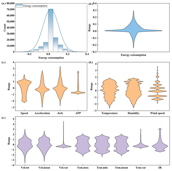 Figure 5c–e presents the descriptive statistics of the factors influencing energy consumption, with all variables standardized prior to the analysis to ensure dimensional consistency. In terms of driving characteristics, Speed and Acceleration exhibited relatively dispersed distributions, indicating considerable variability among the samples, whereas APP demonstrated a more concentrated distribution, suggesting smaller fluctuations. Temperature and humidity exhibited relatively symmetric distributions. In contrast, wind speed displayed a distinctly multimodal distribution that gradually narrows at both ends, indicating that extremely high or low wind speeds occur less frequently. Regarding battery parameters, Vol. tot has a wide distribution range, suggesting significant fluctuations in the battery load over different time periods. Vol. mean also exhibits a broad distribution, while Vol. var remains relatively concentrated, implying that although the overall voltage level of the battery system varies considerably under different conditions, the voltage differences among individual sub-batteries remain relatively stable. Similarly, both Tem. mean and Tem. var indicate substantial temperature variations under different operating conditions, while the internal temperature differences among the sub-batteries remain stable. Tem. max and Tem. min exhibited broad and symmetric distributions, suggesting significant variations in the extreme battery temperatures across different scenarios. IR remains relatively concentrated for most of the time; however, its wide range of fluctuations implies that the battery’s insulation resistance may undergo considerable variation under different operating states.