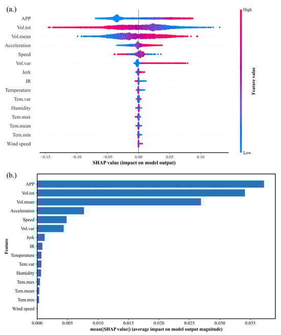 To analyze the impact mechanism of various influencing factors on battery energy consumption, this study applies the SHAP framework to evaluate both the direction and magnitude of each factor’s effect on the dependent variable. Figure 6 presents the feature importance scatter plot and bar chart generated using the SHAP model. Figure 6a shows the distribution of the SHAP values for each feature across all samples. The color represents the feature value for each sample (red indicates high values and blue indicates low values), while the horizontal spread of the points reflects the degree to which each sample influences battery energy consumption. This plot also reveals the overall direction of each feature’s effect on the target variables. Figure 6b ranks the features by importance and presents their average impact on battery energy consumption, which is quantified by the mean absolute SHAP value. By jointly analyzing both plots, we can assess not only the relative importance of each variable but also the direction of its influence, providing an intuitive understanding of the internal mechanism of the stacking model.