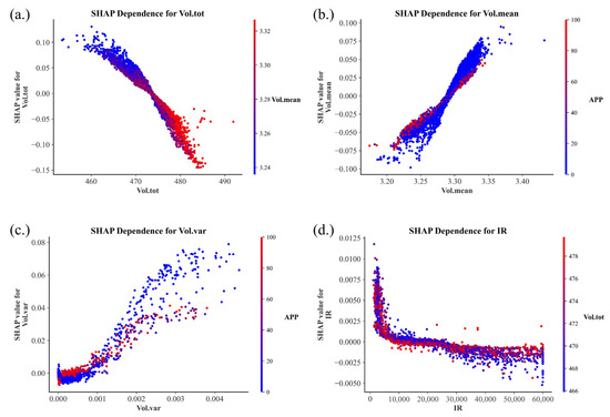 SHAP dependence plots of battery system parameters and their interactions. (a) SHAP dependence plot of Vol. tot; (b) SHAP dependence plot of Vol. mean; (c) SHAP dependence plot of Vol. var; (d) SHAP dependence plot of IR.