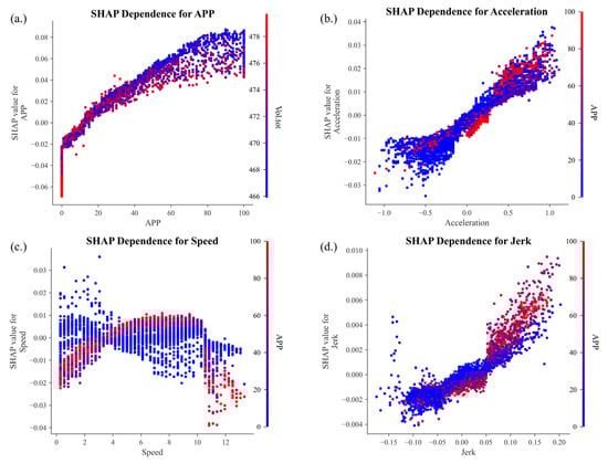 SHAP dependence plots of driving characteristics and their interactions. (a) SHAP dependence plot of APP; (b) SHAP dependence plot of Acceleration; (c) SHAP dependence plot of Speed; (d) SHAP dependence plot of Jerk.
