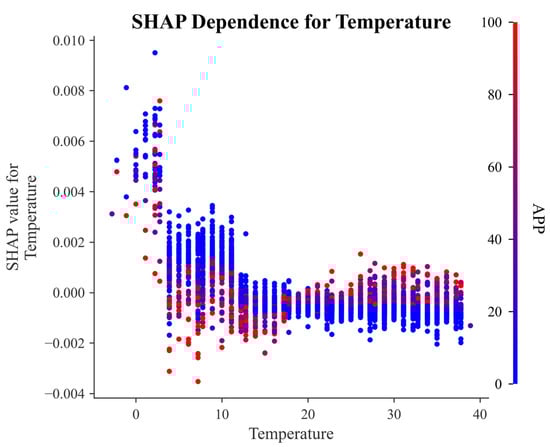 Figure 10 illustrates the SHAP dependence of Temperature on battery energy consumption. Overall, Temperature exhibits a clear negative correlation with SHAP values. A critical threshold is observed at approximately 13 °C, where the SHAP value shifts from positive to negative. This indicates that lower ambient temperatures are associated with higher energy consumption during vehicle operation, which may be attributed to increased use of heating systems and changes in battery electrochemical activity under cold conditions. This finding highlights the importance of enhancing the adaptability of energy management strategies in low-temperature environments. In particular, incorporating temperature-aware energy consumption prediction and optimization mechanisms is essential to improve the operational efficiency and range stability of battery systems under varying climate conditions.