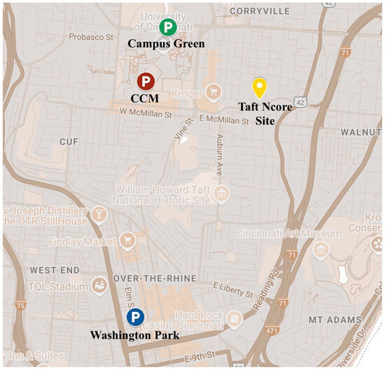 - Parking. Available online: https://www.3cdc.org/where-to-park/ (accessed on 31 May 2025).