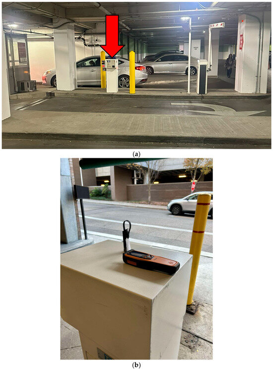 For sampling, monitoring instruments were placed on top of ticket boxes in each garage. Figure 2a and Figure 2b illustrate the sensor placement at the parking garage gate, where the arrow indicates the location of the ticket box. Vehicles stop at the box to either obtain a ticket, scan the parking validation, or wait for the gate to open if the vehicle has automatic validation. The number of vehicles entering and exiting the garage was recorded in 10-min intervals to better understand how traffic influences pollutant concentrations at gate locations. These data were then used to make correlations between fluctuations in pollutant concentrations and changes in traffic volume to determine how emissions are affected by traffic patterns. In addition to gate monitoring, this study also included a “walking” segment, where the tester carried the sensors while walking inside the garages at various locations.