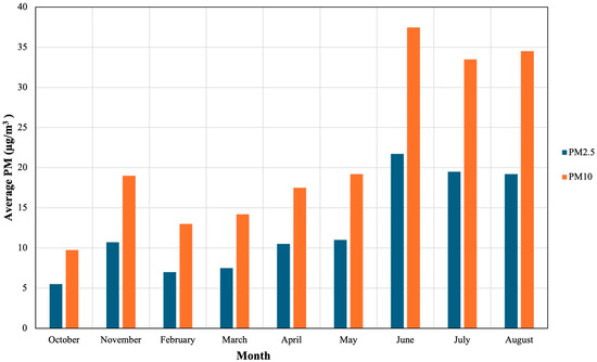 Figure 3 shows the average PM2.5 and PM10 averages distributed monthly. Seasonal trends suggest that the highest particulate concentrations were reported during the summer months. Both PM2.5 and PM10 concentrations increase steadily starting from February (winter), with the most significant jump occurring between May and June. In June, average PM2.5 concentrations reach a high of 21.73 µg/m3 and 37.46 µg/m3 for PM10. These PM2.5 concentrations are higher than the primary annual EPA National Ambient Air Quality Standard (NAAQS) of 9.0 μg/m3 and the secondary standard of 15.0 μg/m3, but less than the 24 h limit of 35.0 μg/m3.