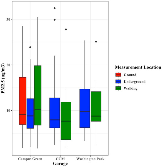 Figure 4 shows PM2.5 concentrations by garages and sensor locations. Campus Green ground level measurements show high variability with concentrations ranging from 1.80 µg/m3 to 28.59 µg/m3 with a median of 9.72 µg/m3. Underground gate concentrations are lower with less variation, with a similar median of 9.63 µg/m3. Walking measurements show a broader spread of concentrations representing the dataset’s highest median and maximum concentrations. The mean walking concentration is 14.34 µg/m3 for Campus Green, 10.33 µg/m3 for CCM, and 10.90 µg/m3 for Washington Park. Both underground and walking measurements for CCM show lower overall concentrations and less variability, with medians from 7 to 9 µg/m3. However, outliers are more frequent within the CCM dataset than in the other two garages. Washington Park underground measurements show slightly higher concentrations than walking measurements.