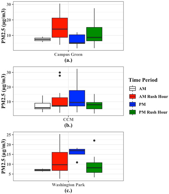 At the Washington Park Garage (Figure 5c), PM non-rush hours had the highest median concentration within the data of 15.78 µg/m3 and are tightly clustered. AM rush hour reported the second highest in concentrations with a mean of 11.51 µg/m3 and a maximum value of 25.36 µg/m3.