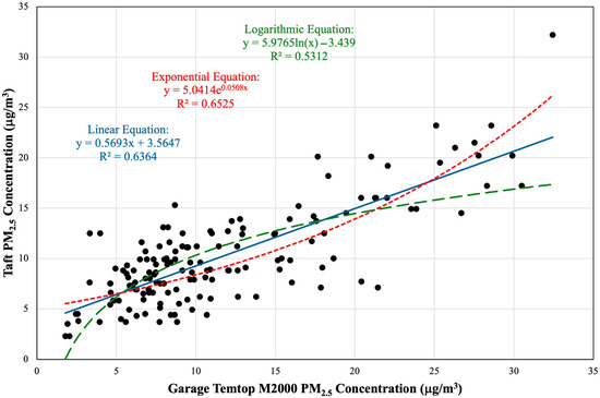High correlations are also obtained from logarithmic and exponential regressions. However, some scatter and variability indicate that other factors, such as traffic and garage structure, may also affect pollution in garages. Similarly, a linear regression of PM10 concentrations between garages and the ambient is also shown in Figure S8, with a slightly lower R2 of 0.44.