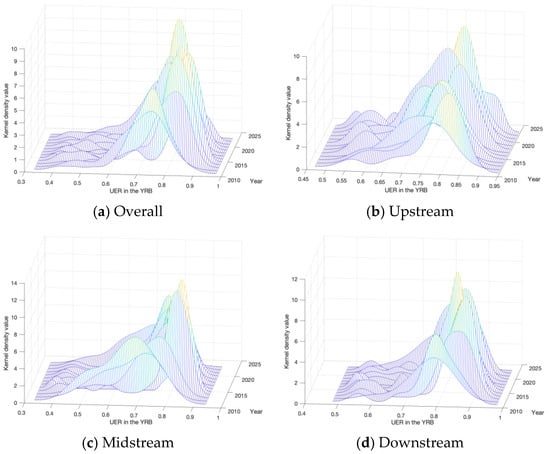The kernel density curve of the entire basin showed a continuous rightward shift of the main peak from 2011 to 2023, stabilizing in the 0.6–0.9 range. Particularly, after the implementation of initiatives such as the South-to-North Water Diversion, Grain for Green Program (2013), and the Double Carbon Policy (2022), the main peak notably sharpened and narrowed, reflecting the strengthening impacts of major projects and policies on UER. However, the curve’s tailing and “main-secondary peak” pattern revealed developmental imbalance between developed cities and mid-upstream regions.